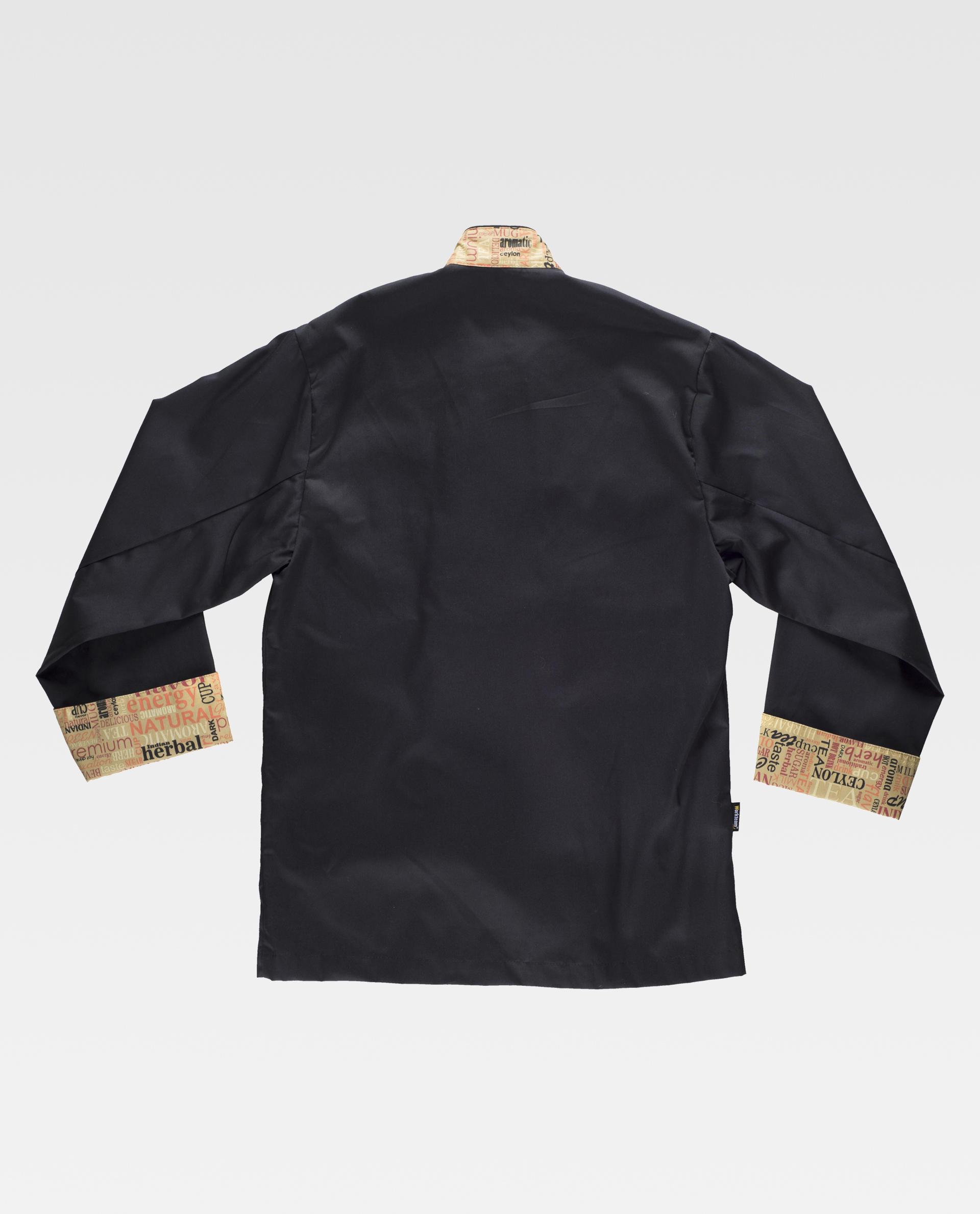 Chaquetilla de cocina unisex combinada. Cuello Mao estampado y solapa cruzada con cierre de doble botonadura. Manga con puño vuelto estampado. Vivo en cuello y solapa. Botones de seguridad al tono. Acabado antimanchas. Casaca B9203. Envío GRATIS. Descuentos por cantidad hasta 60%. Calcula tu precio Online.