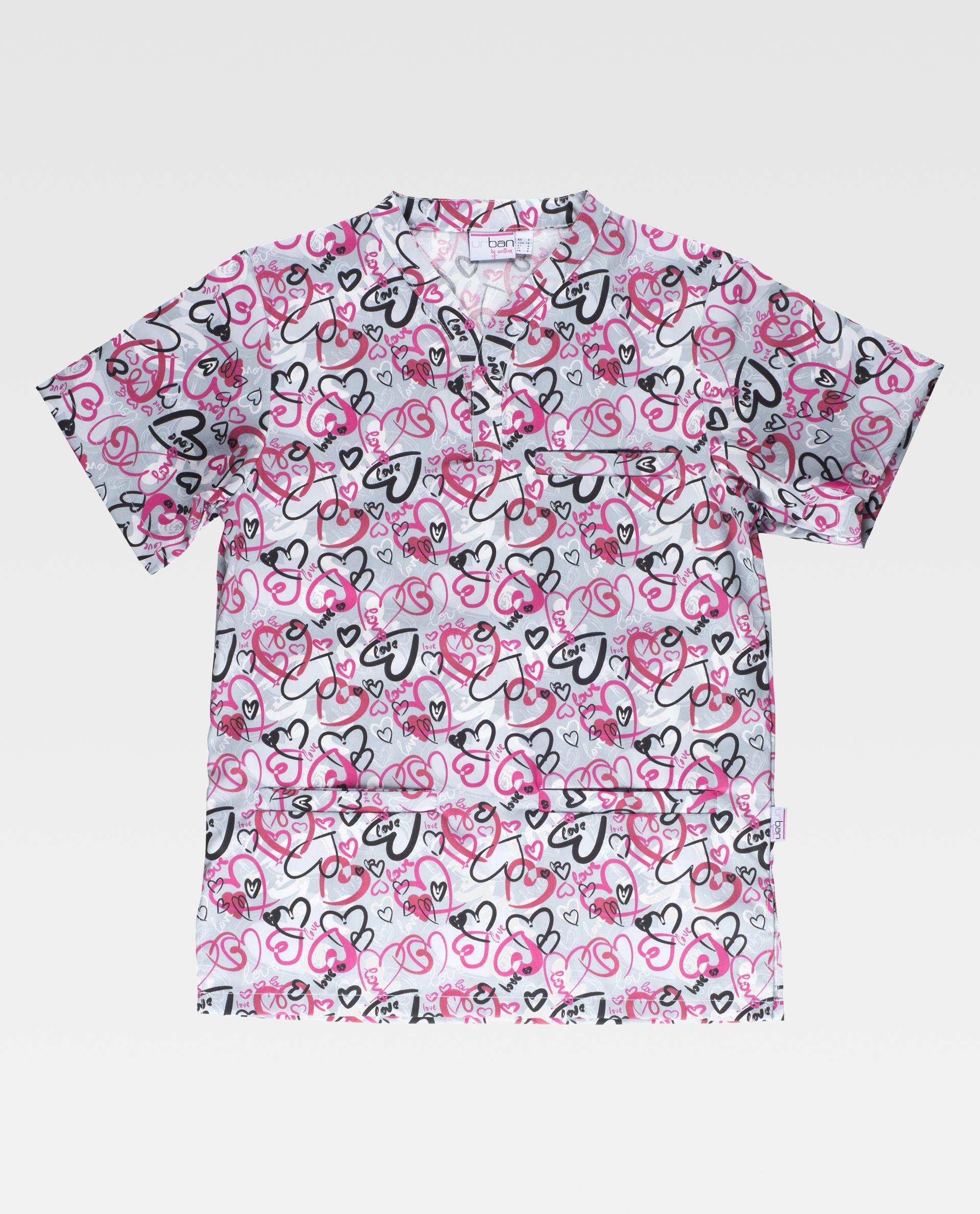 Casaca unisex de manga corta con estampado de corazones multicolor y acabado antimanchas. Cuello cruzado de tirilla, un bolso de pecho y dos laterales de ojal. Aberturas en los costados. Casaca unisex de manga corta con estampado de corazones multicolor y acabado antimanchas. Cuello cruzado de tirilla, un bolso de pecho y dos laterales de ojal. Aberturas en los costados.