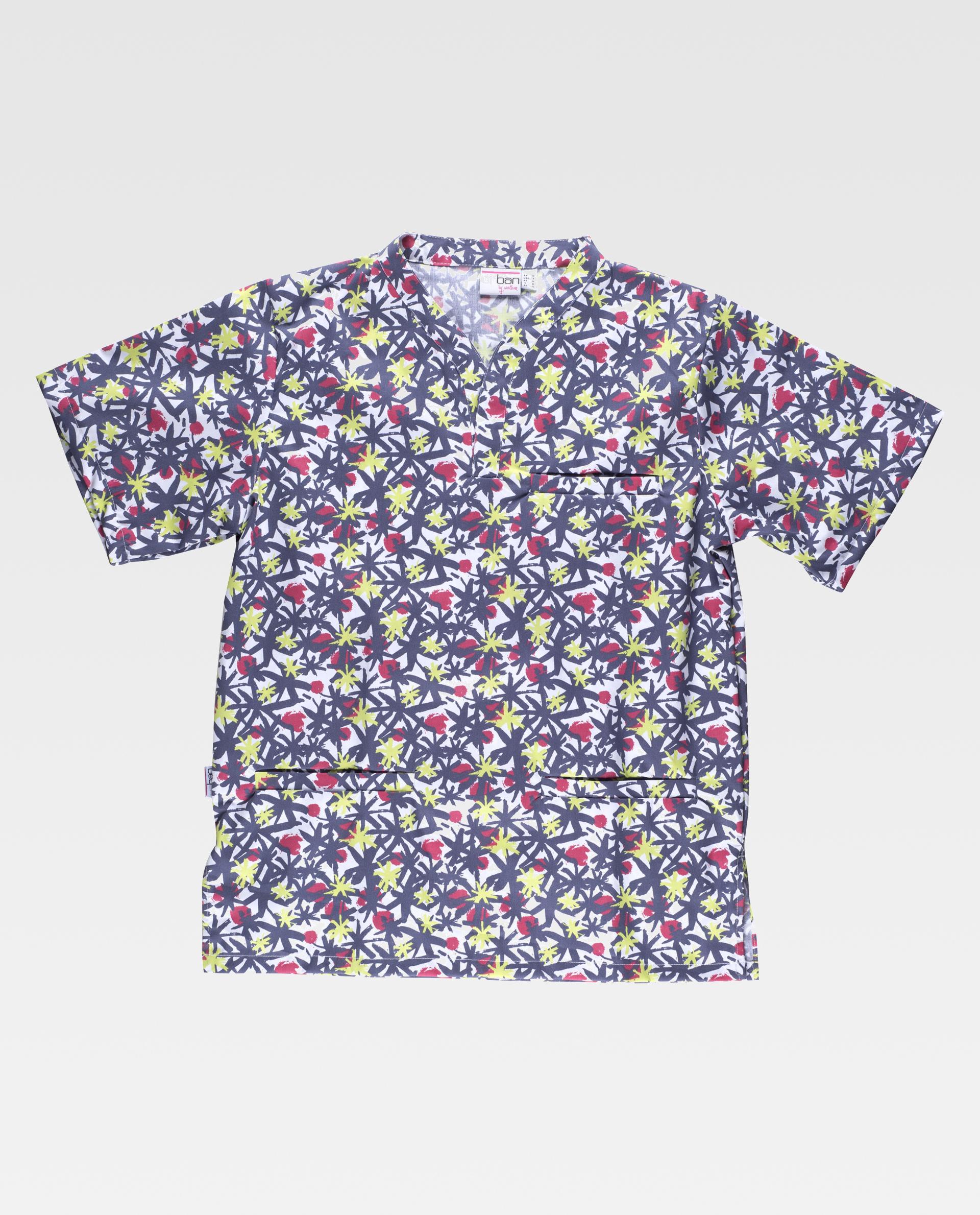 Casaca unisex de manga corta con estampado multicolor y acabado antimanchas. Cuello cruzado de tirilla, un bolso de pecho y dos laterales de ojal. Aberturas en los costados. Casaca unisex de manga corta con estampado multicolor y acabado antimanchas. Cuello cruzado de tirilla, un bolso de pecho y dos laterales de ojal. Aberturas en los costados.