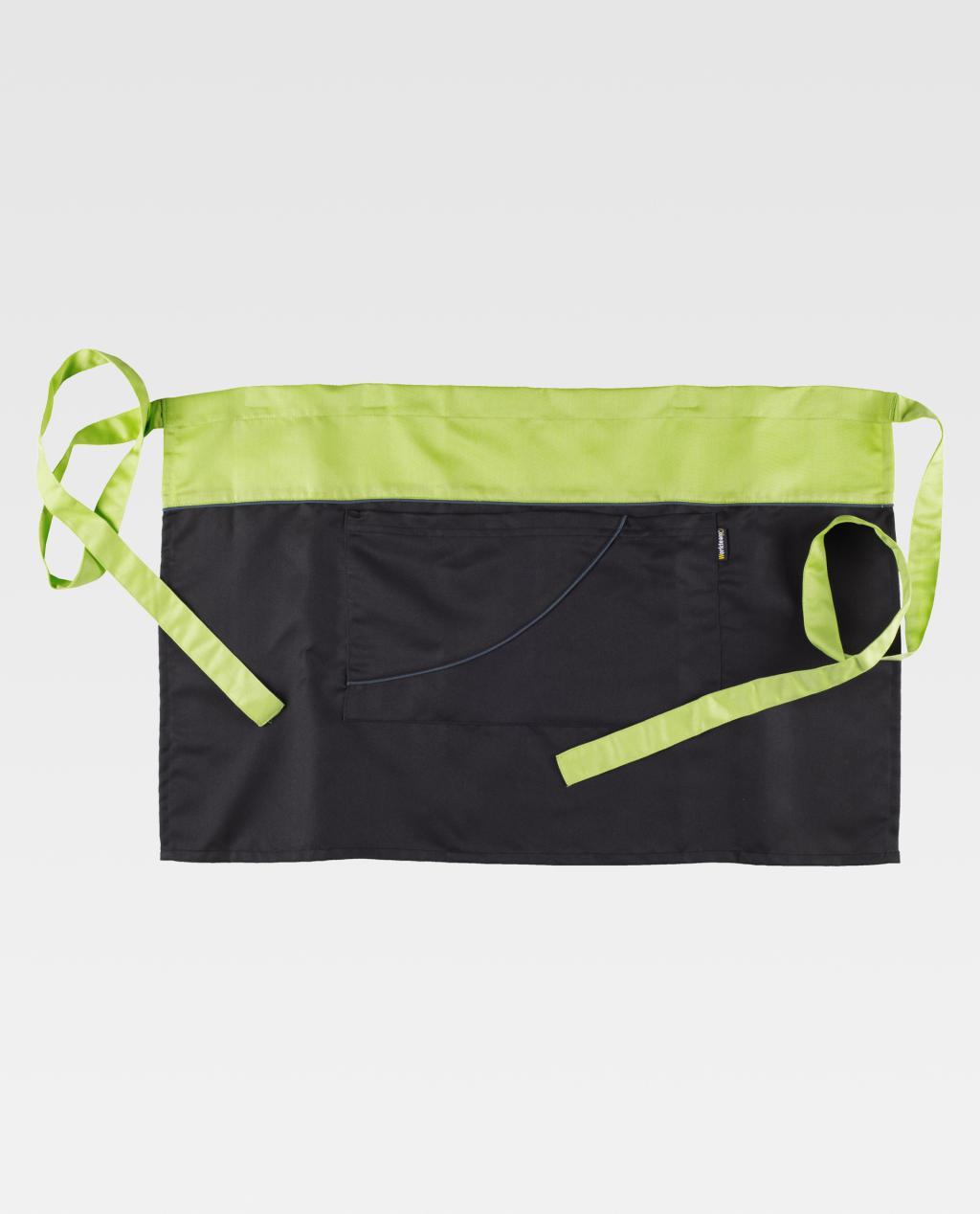 ↵Delantal francés corto con parte superior y cintura combinada. Un bolso central con corte de fantasía rematado con vivo. Tiras para ajustar en la cintura. 70X45 cm.
